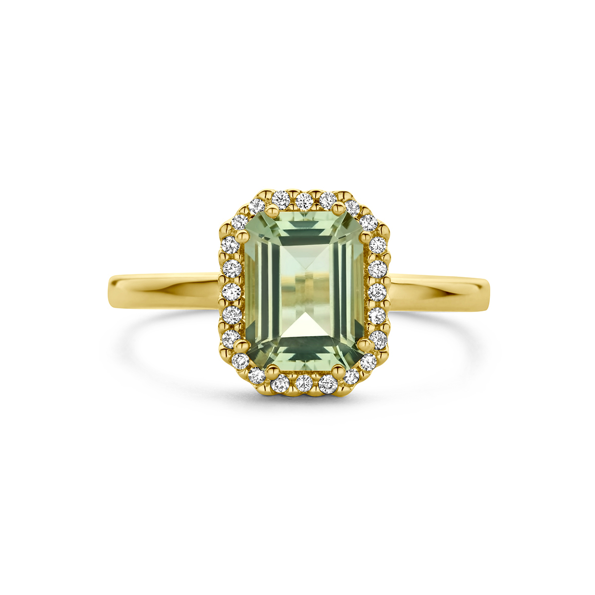 14k Geelgouden ring uitgevoerd met groen amethist en diamanten. De ring heeft een breedte van 10.5mm.