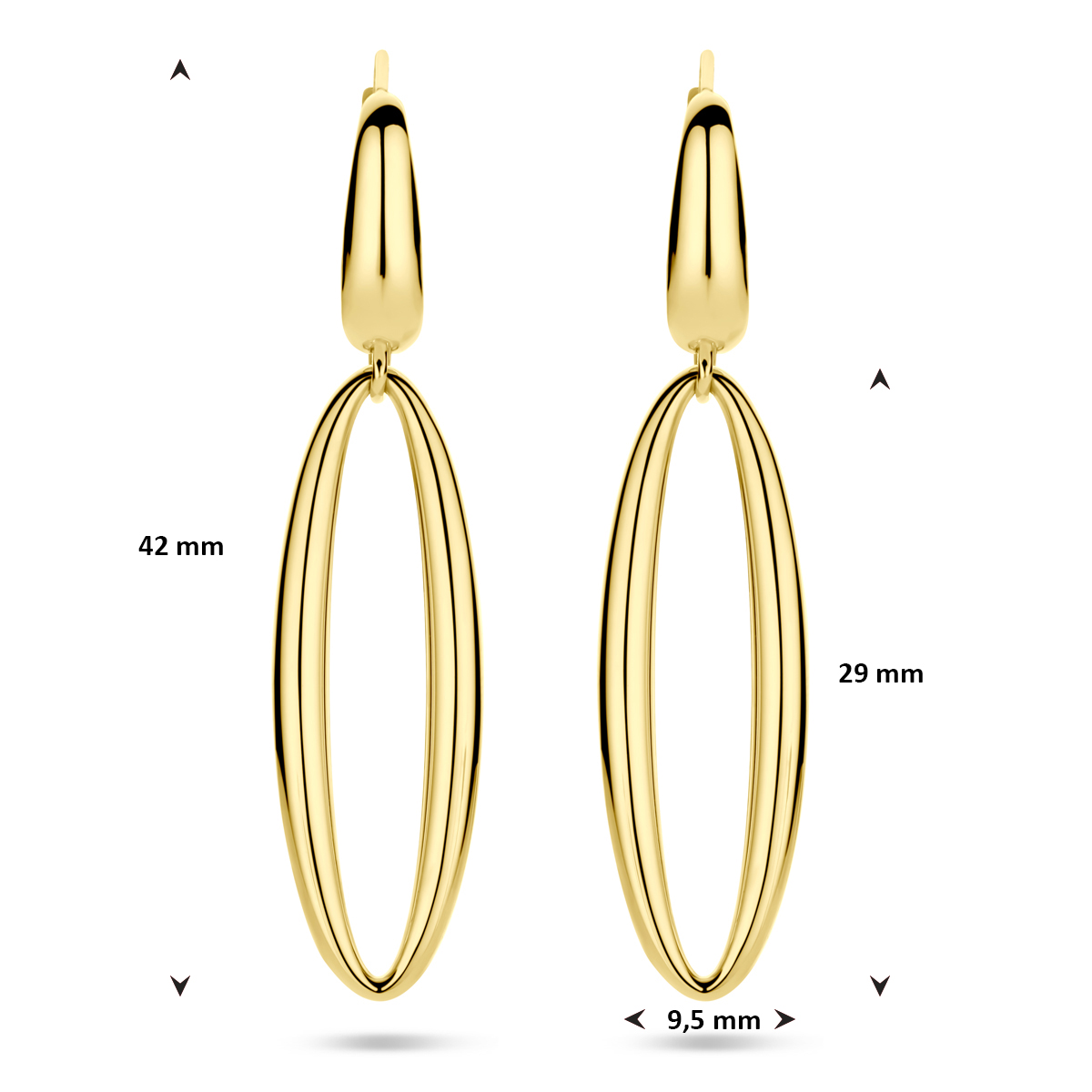 Deze prachtige 14-karaats geelgouden oorhangers kenmerken zich door hun luxe glans en zijn nikkelvrij, ideaal voor gevoelige oren. Met een breedte van 9,5 mm zijn ze subtiele blikvangers. Perfect voor dagelijks gebruik of speciale gelegenheden, accentueren ze je look met een vleugje elegantie. Draag ze met vertrouwen en stijl!