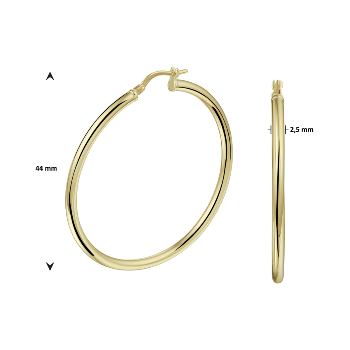 14k Geelgouden oorringen met 925 zilveren kern uitgevoerd met een stevige scharnier sluiting. De oorringen hebben een diameter van 44mm.