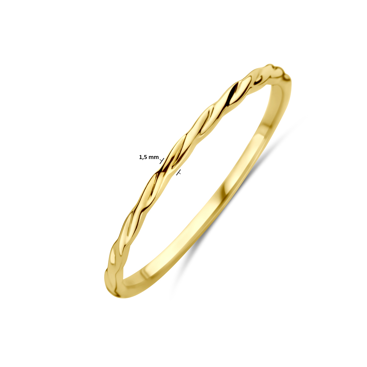 De 14krt. geelgouden aanschuifring met gedraaide bovernzijde is een stijlvolle gouden ring. Deze heeft maat 54, een breedte van 1,5 mm, en is hoogglanzend afgewerkt. Perfect om alleen te dragen of te combineren met andere ringen voor een persoonlijke touch. Ideaal voor dagelijks gebruik en speciale gelegenheden. Voeg een gouden glans toe aan je look!