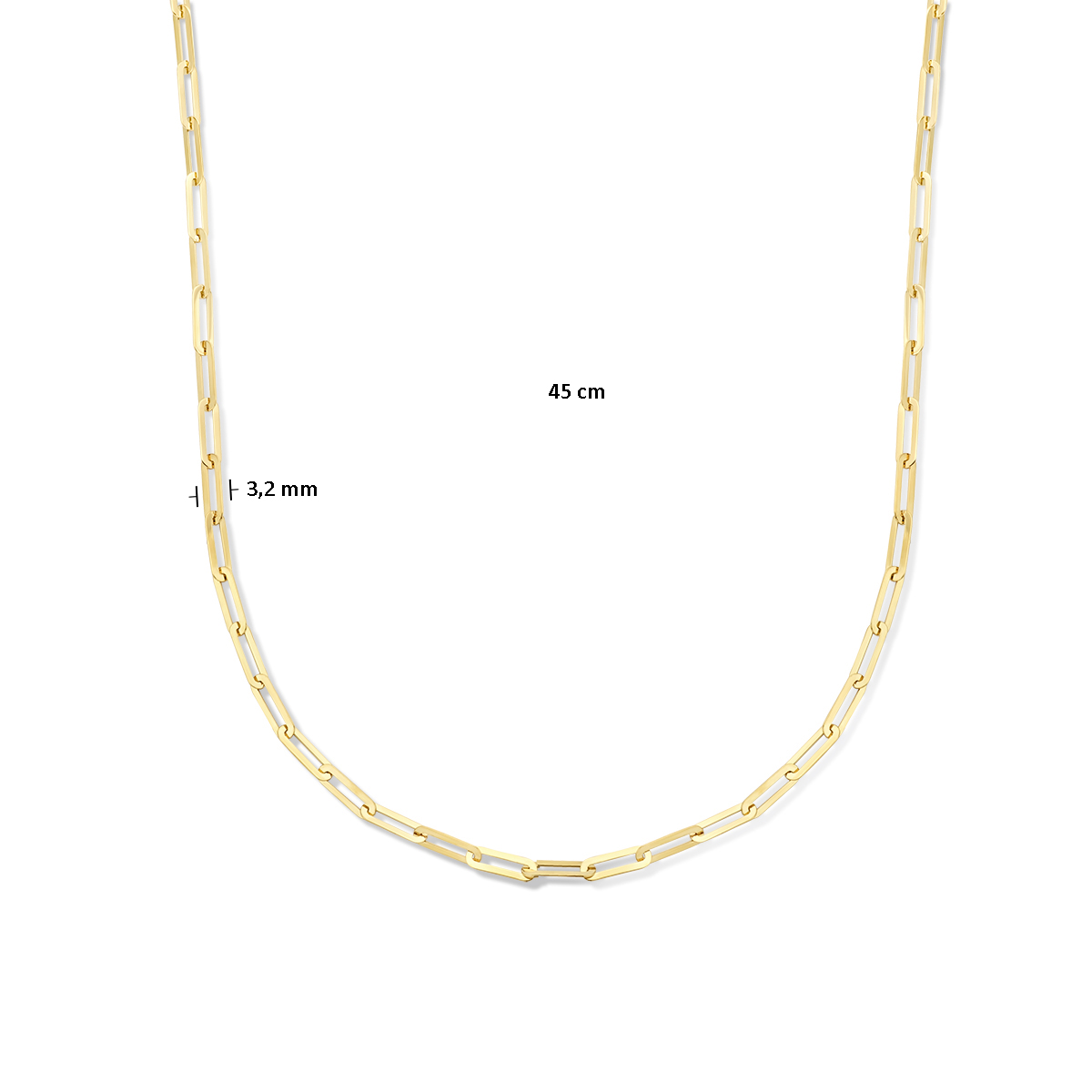 14k Geelgouden collier met een schakelbreedte van 3.2mm en een draaglengte van 45cm. Uitgevoerd met karabijnsluiting.