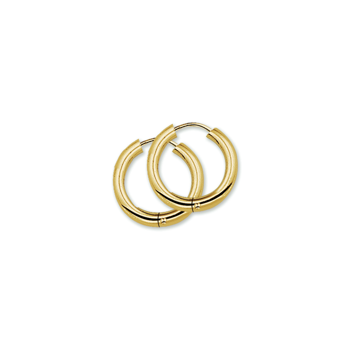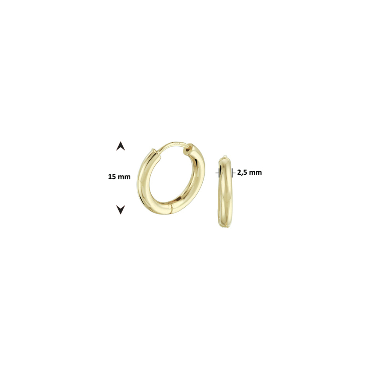 De 14krt. Geelgouden klap oorringen (scharnier), modelnummer 4022737, zijn ronde creolen met een glanzende afwerking. Ze zijn goudkleurig, hebben een diameter van 15 mm en een breedte van 2,5 mm. Het totale gewicht is 1,47 gram. Perfect als stijlvolle aanvulling op zowel casual als formele outfits. Draag bij voorkeur met opgestoken haar om de elegante uitstraling te benadrukken.