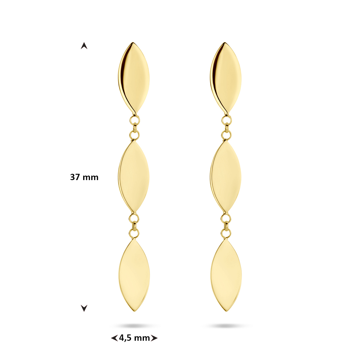 Ontdek de elegante 14krt. geelgouden oorhangers. Deze schitterende studs van goud wegen 1,63 gram en hebben een glanzende afwerking. Met een breedte van 4,5 mm en een lengte van 37 mm, zijn ze perfect als subtiele, maar verfijnde toevoeging aan elke outfit. Draag ze bij zowel formele als dagelijkse gelegenheden voor een tijdloze uitstraling.