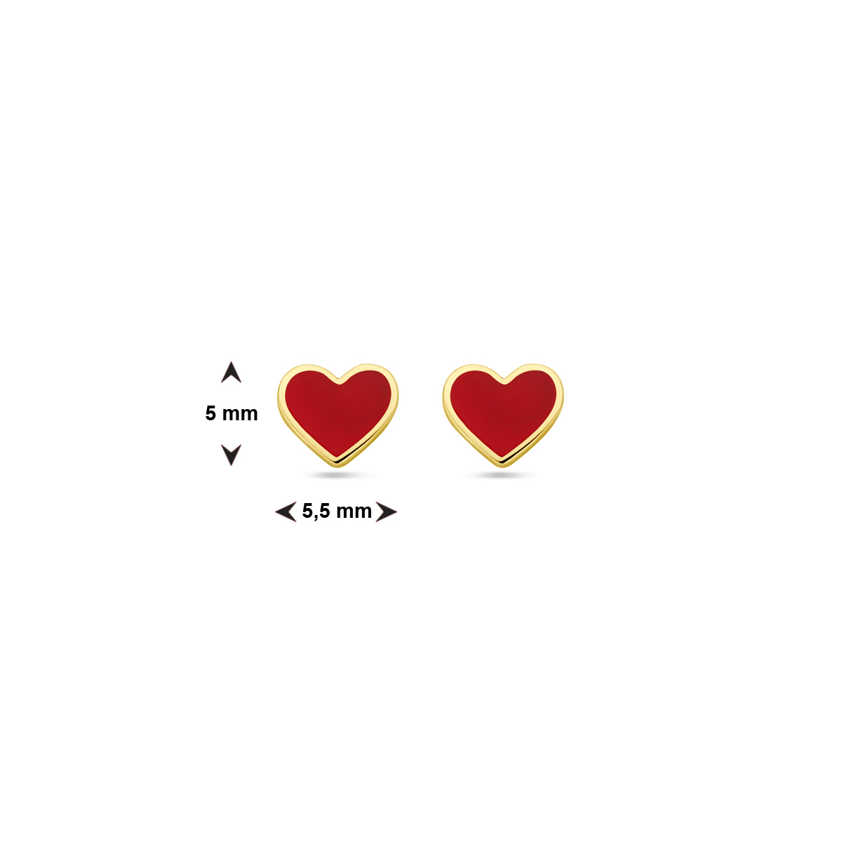 14k Geelgouden oorknoppen uitgevoerd met rood emaille in de vorm van een hartje. De oorknoppen hebben een afmeting van 5x5.5mm.