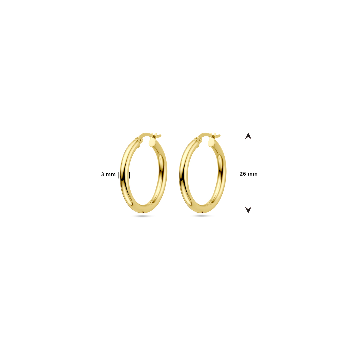 Ontdek de tijdloze elegantie van deze 14krt. geelgouden oorringen met modelnummer 4013189. Met een ronde buis van 3,0 mm en een diameter van 26 mm stralen deze glanzende creolen luxe uit. Gemaakt van hoogwaardig goud, wegen ze 2,36 gram. Perfect voor zowel dagelijkse stijl als speciale gelegenheden, voegen ze een gouden glans toe aan elke look.