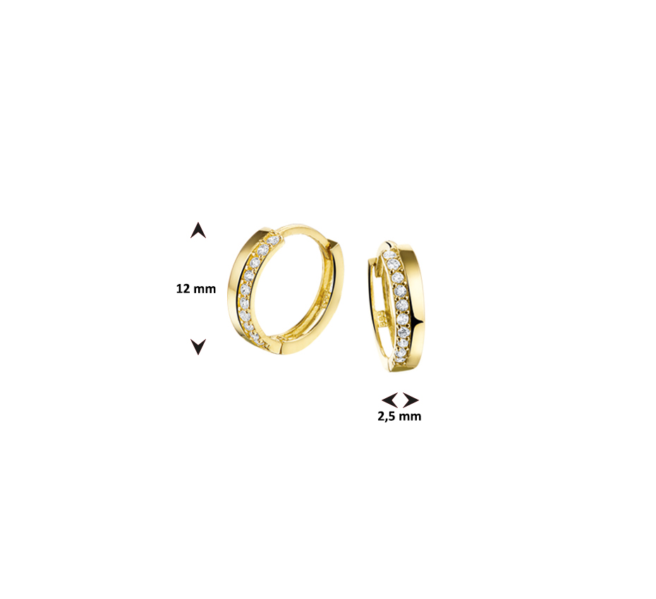 14krt geelgouden oorringen met zirkonia, modelnummer 4022739, zijn elegante creolen met een gewicht van 1,17 gram. Gemaakt van glanzend goud, hebben ze een breedte van 2,5 mm en een diameter van 12 mm, en stralen een gouden kleur uit. Draag deze verfijnde oorringen voor een subtiele doch luxueuze uitstraling bij elke gelegenheid.