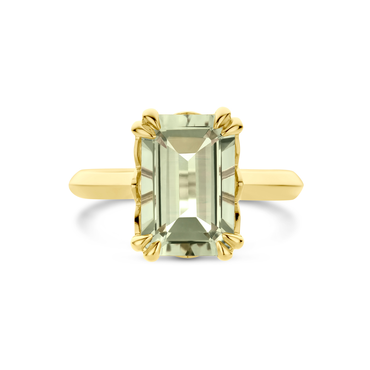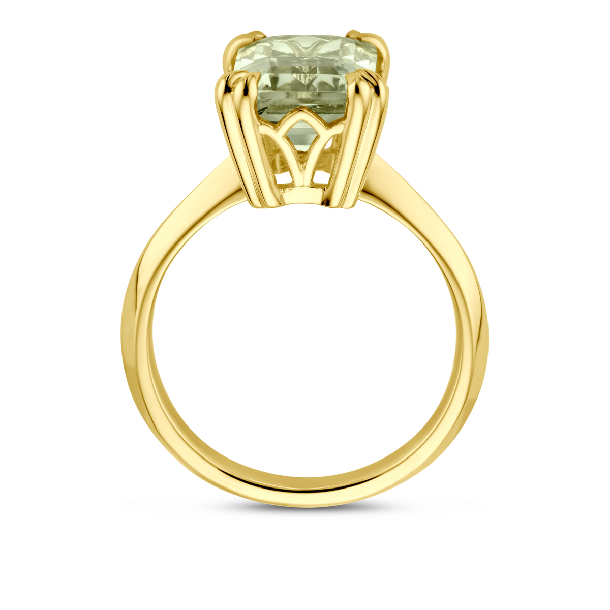 14k Geelgouden ring uitgevoerd met groen amethist. De ring heeft een breedte van 13mm.