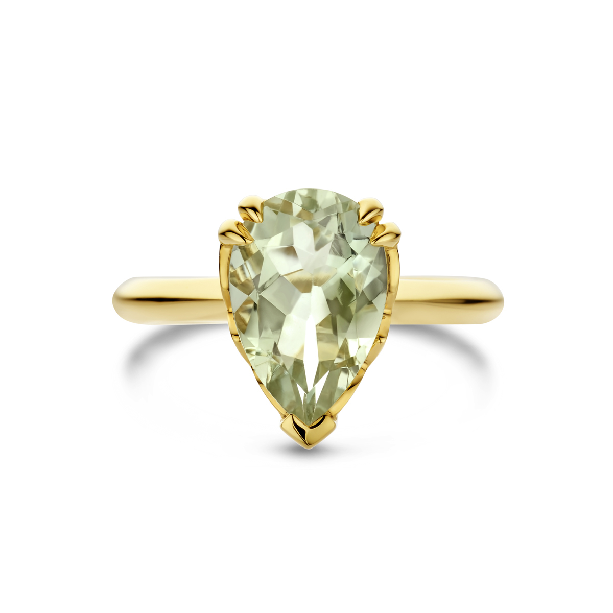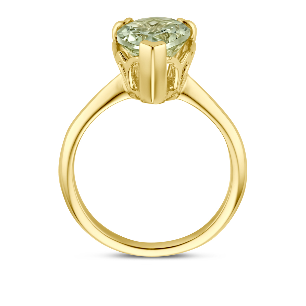 14k Geelgouden ring uitgevoerd met groen amethist. De ring heeft een afmeting van 13x9mm.