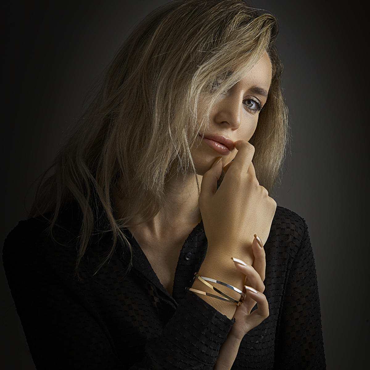 Sieraden van 14 karaat goud met daarin een kern van 925 zilver. Geelgouden bangle met scharnier-sluiting.