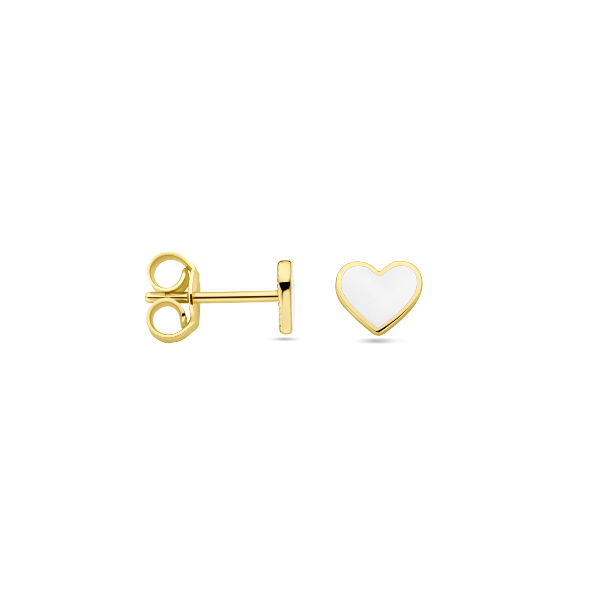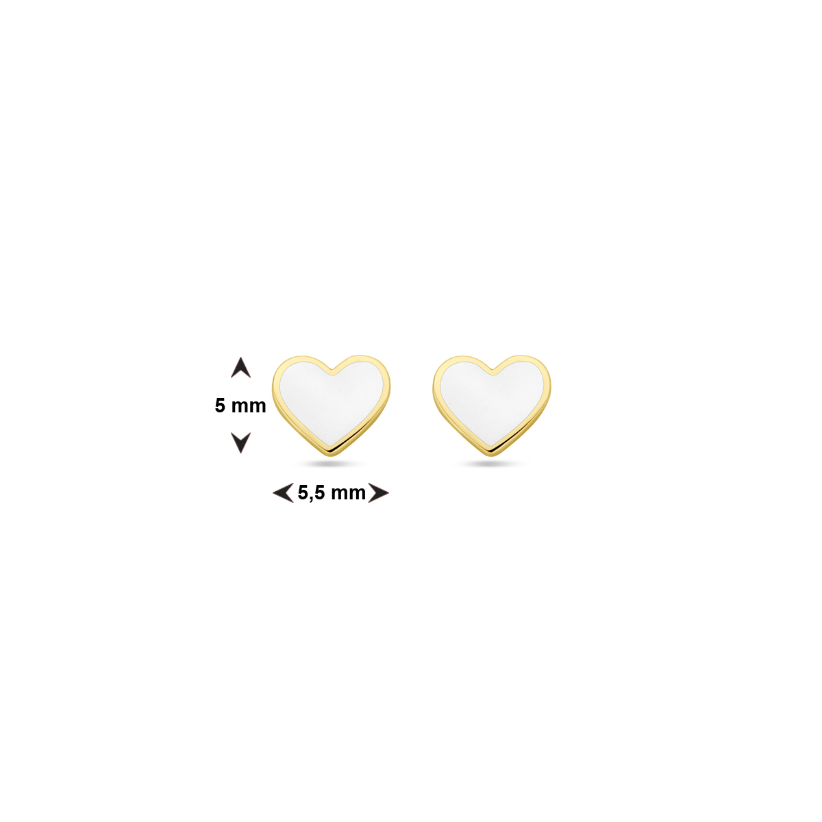 14k Geelgouden oorknoppen uitgevoerd met wit emaille in de vorm van een hartje. De oorknoppen hebben een afmeting van 5x5.5mm.