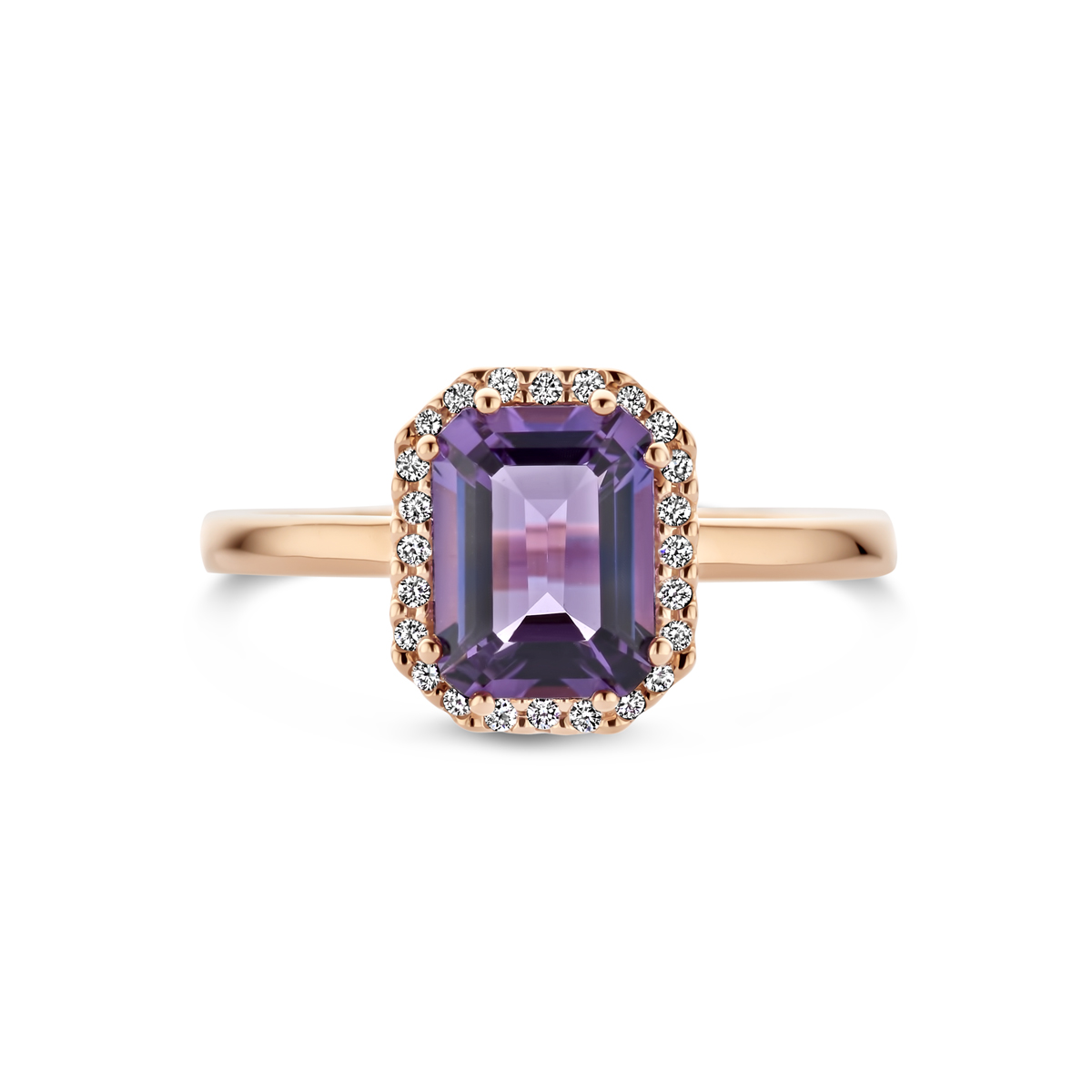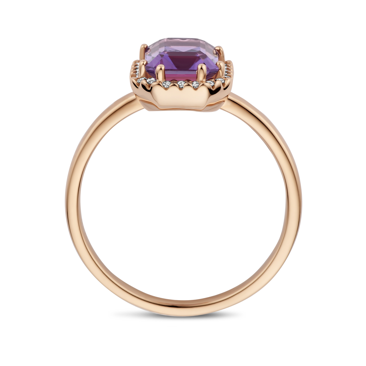 14 krt Roségouden ring is bezet met een schitterende amethist en 0.10ct diamanten. De ring straalt elegantie en stijl uit en is perfect voor dagelijks gebruik of voor speciale gelegenheden. Draag deze ring alleen of combineer hem met andere sieraden voor een unieke en persoonlijke look. Maak je outfit compleet met deze prachtige ring!