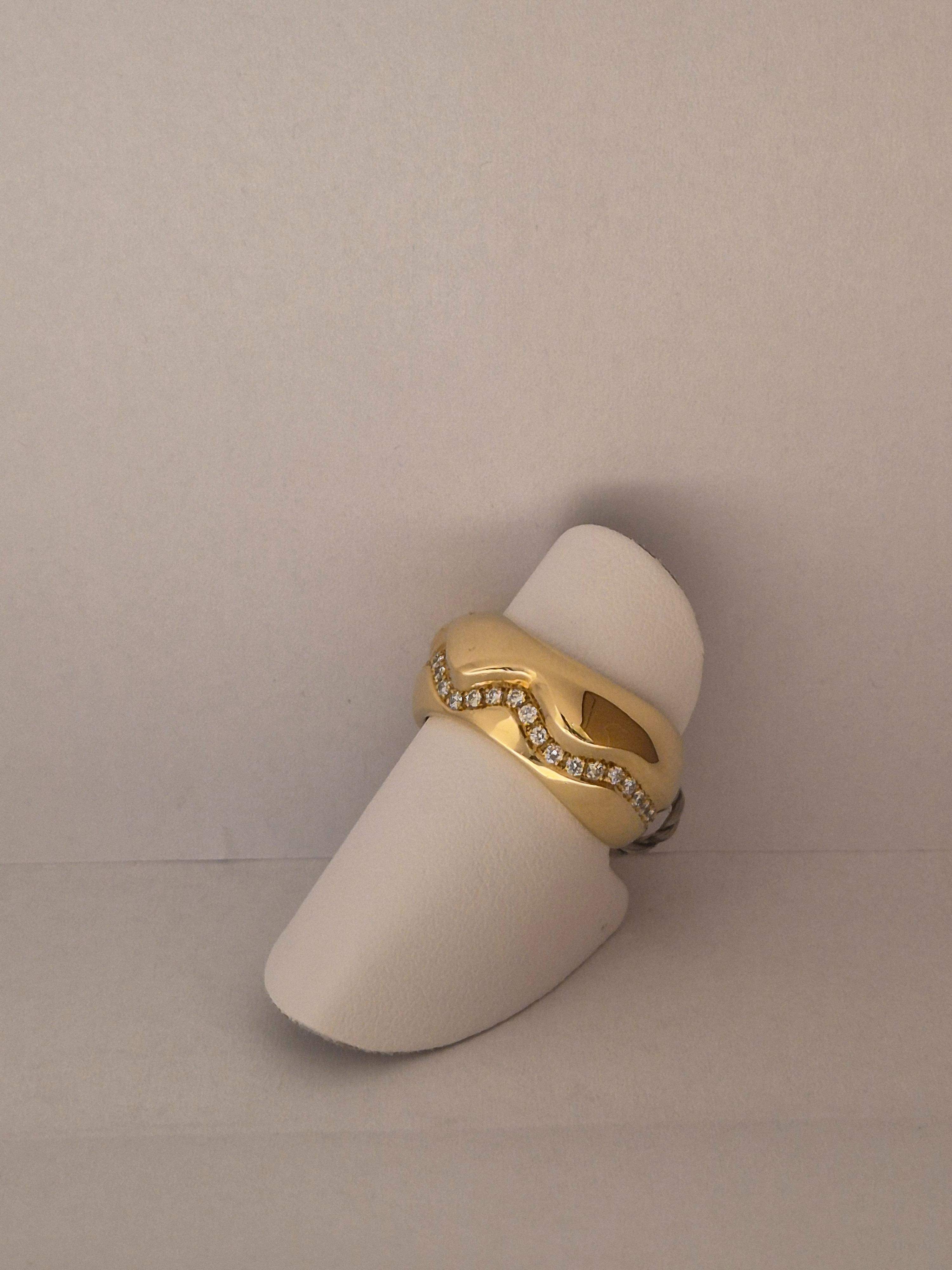 De 18krt. geelgouden ring, is een schitterende keuze met 26 briljant geslepen diamanten (0.26ct). De ring is nikkelvrij, heeft een glanzende afwerking en maat 53. Het beste te dragen als elegante statement ring voor dagelijkse glamour of speciale gelegenheden. Voeg een vleugje luxe toe aan elke outfit.