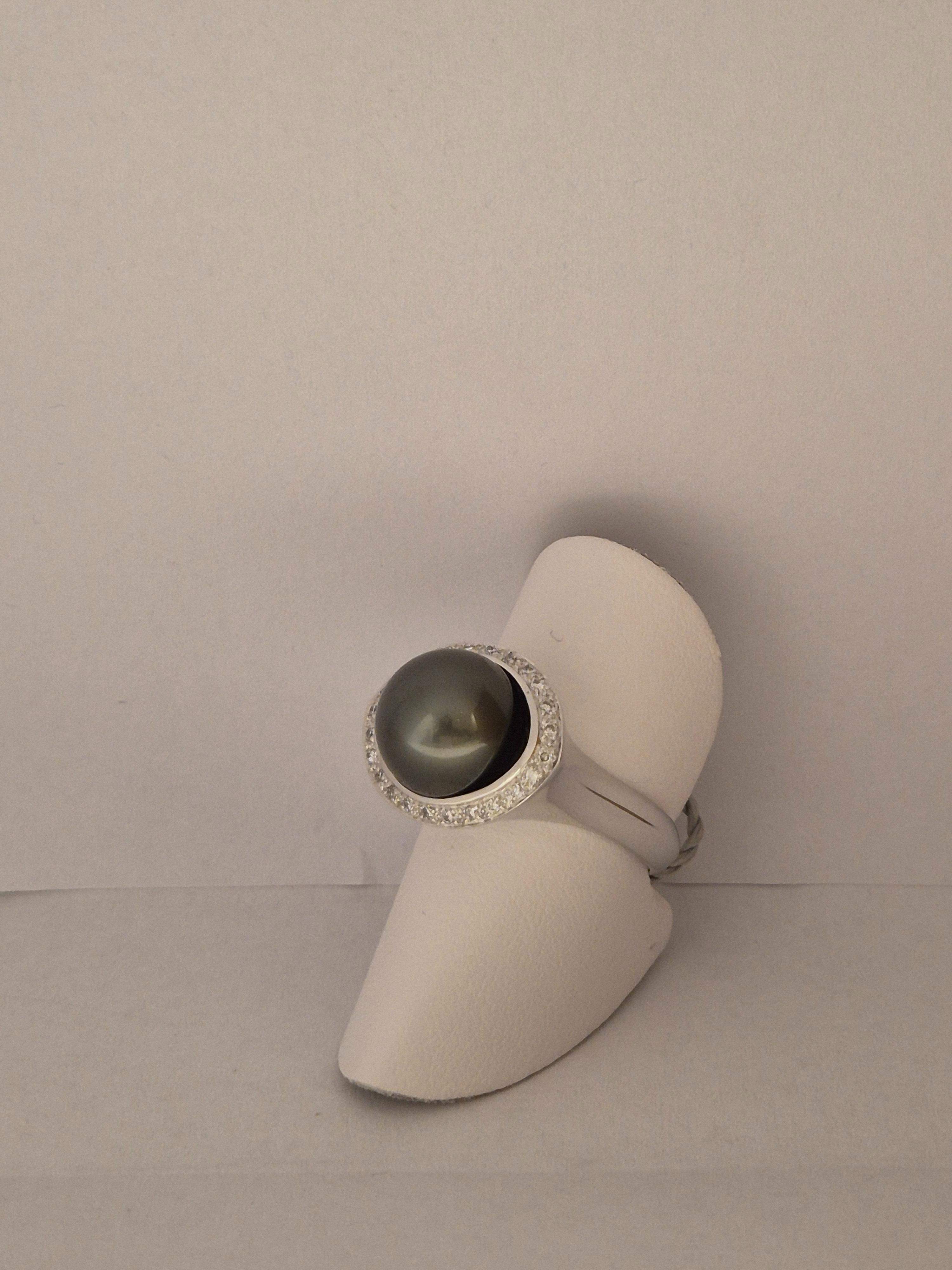 Deze prachtige 18-karaats witgouden ring, model heeft 24 briljant geslepen diamanten (0.17ct) en een elegante grijze parel, perfect voor speciale gelegenheden. Het beste te dragen op ringmaat 54, als statement piece of combineer met andere sieraden voor een verfijnde look. Een tijdloze toevoeging aan elke juwelen collectie.