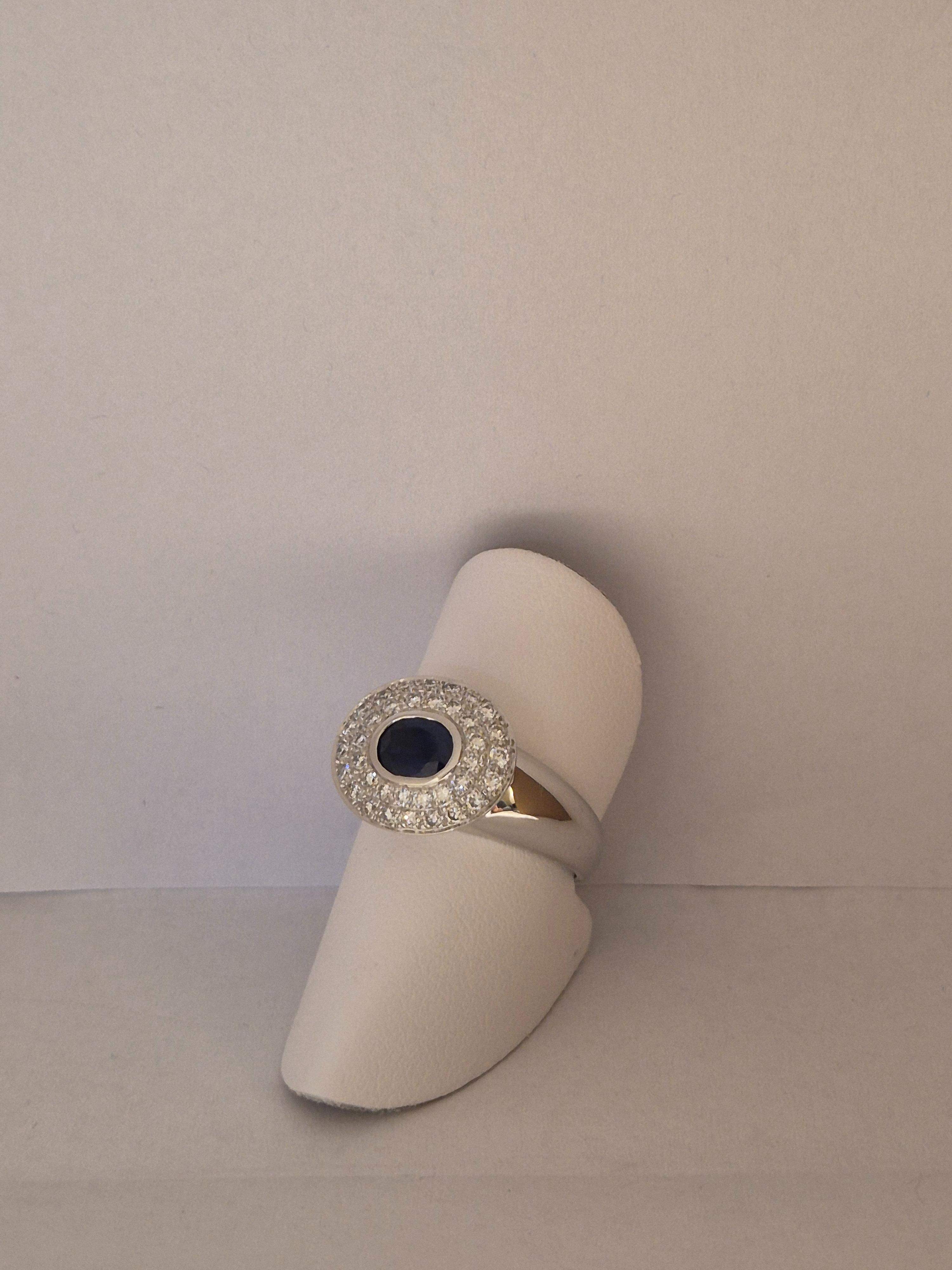 De 18krt witgouden ring model  heeft een elegante saffier en diamant. Deze ring, maat 54, valt onder de categorie juweel en is perfect voor elke gelegenheid. Draag hem als statement piece op een speciale avond, of combineer met andere sieraden voor een verfijnde alledaagse look.