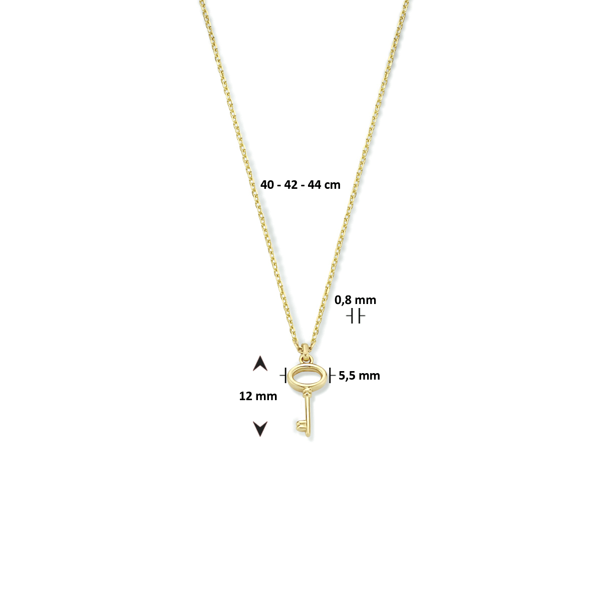 14k Geelgouden collier met een hanger in de vorm van een sleutel. Het collier heeft draaglengtes van 40, 42 en 44cm. De hanger heeft een afmeting van 12x5.5mm.