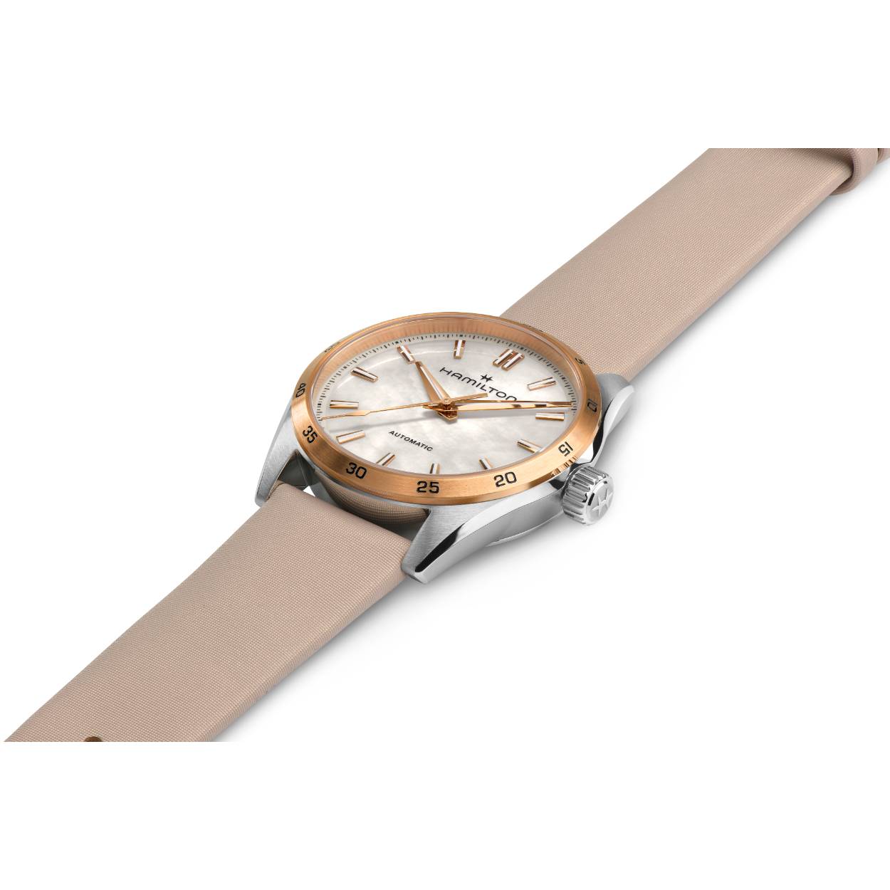 De Jazzmaster Performer-lijn is gemaakt voor degenen die de voorkeur geven aan functie en stijl tegelijk en biedt een krachtige sport-chique uitstraling. Aangedreven door het H-10 automatische uurwerk met 80 uur gangreserve, heeft deze Jazzmaster Performer Automatic een 34 mm roestvrijstalen kast met een roségouden PVD-gecoate bezel geaccentueerd door een iriserende parelmoeren wijzerplaat en een beige satijnen band.