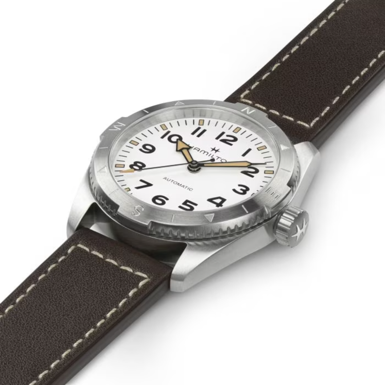 De Hamilton Khaki Field Expedition H70225510 is een hoogwaardige horloge met Zwitserse automatische beweging, een ronde roestvrijstalen kast van 37 mm en een witte wijzerplaat met Arabische cijfers. Het heeft een saffierglas en een bruine leren band van 20 mm. Waterbestendig tot 10 ATM. Ideaal voor dagelijks gebruik of avontuurlijke uitstapjes, comfortabel en hypoallergeen.
