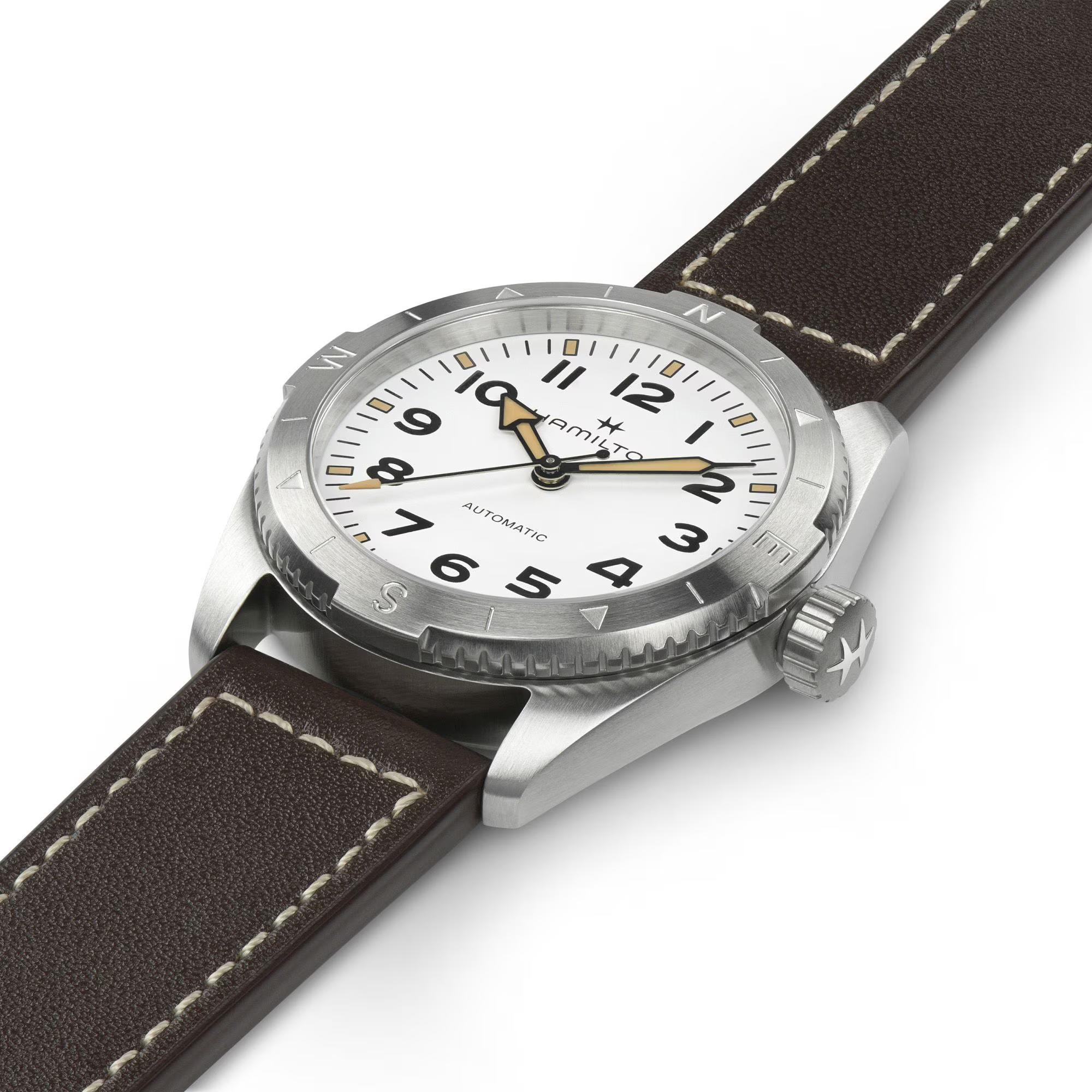 De Hamilton Khaki Field Expedition H70225510 is een elegant horloge met Zwitserse automatische beweging. Het heeft een ronde, zilverkleurige roestvrijstalen kast van 37 mm met saffierglas, een witte wijzerplaat met Arabische indexen en een bruine leren band. Waterdicht tot 100 meter. Draag het als dagelijks accessoire voor een klassieke, stijlvolle uitstraling. Perfect voor elke gelegenheid.