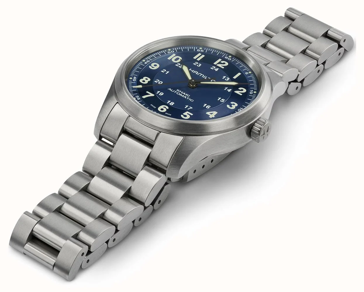 De Hamilton Khaki Field H70205140 is een verfijnd horloge met Zwitserse automatische beweging. Het heeft een titanium kast en band, een blauwe wijzerplaat met Arabische cijfers, en saffierglas. Dit horloge is 10 ATM waterdicht en nikkelvrij. Ideaal voor dagelijks gebruik of avonturen in de natuur, dankzij de robuuste en hypoallergene materialen. Perfect te dragen bij casual of outdoor outfits.