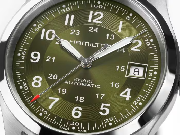 De Hamilton Khaki Field H70455560 is een automatische polshorloge met een roestvrijstalen kast en een groen wijzerplaat met duidelijk leesbare Arabische cijfers.  Het horloge heeft een bruin lederen band, een saffierglas en biedt een datumaanduiding. Waterbestendigheid tot 100 meter. Perfect te dragen bij casual en outdoor gelegenheden dankzij het robuuste en stijlvolle ontwerp.