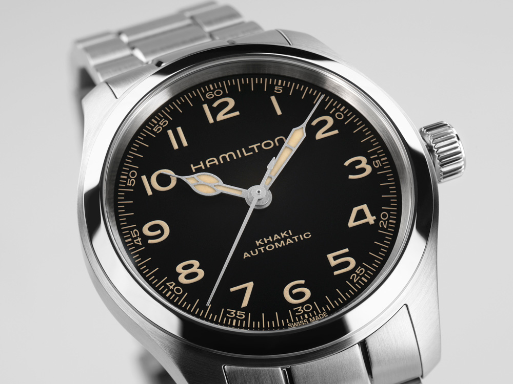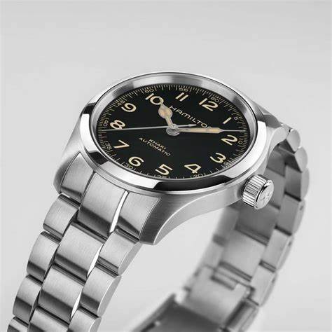 De Hamilton Khaki Field Murph H70405130 horloge heeft een roestvrijstalen kast en band, zwarte wijzerplaat met Arabische cijfers, saffierglas en automatische Zwitserse beweging. Het is waterdicht tot 10 bar. Draag deze stijlvolle, analoge polshorloge met zilverkleurige details voor zowel formele als casual gelegenheden. Het is nikkelvrij en allergievriendelijk, ideaal voor dagelijks gebruik.