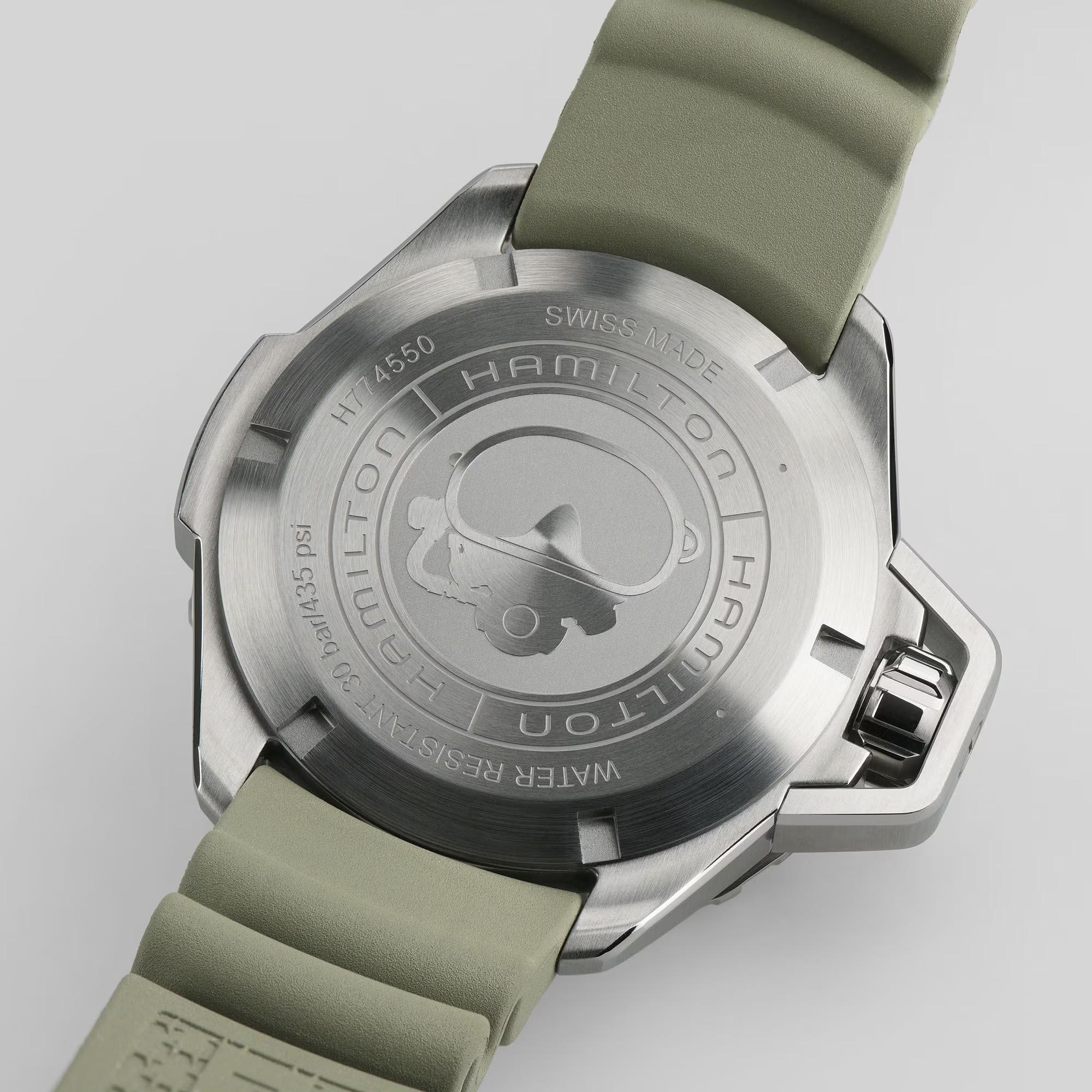De Hamilton Khaki Navy Frogman H77455331 is een luxe horloge met een Zwitserse automatische beweging in een roestvrijstalen kast van 41 mm. Het heeft een zwarte analoge wijzerplaat met strepen, een groene rubberen siliconen band en een saffierglas. Waterdicht tot 300 meter, ideaal voor duiken en dagelijks gebruik. Draag het bij casual of avontuurlijke outfits.