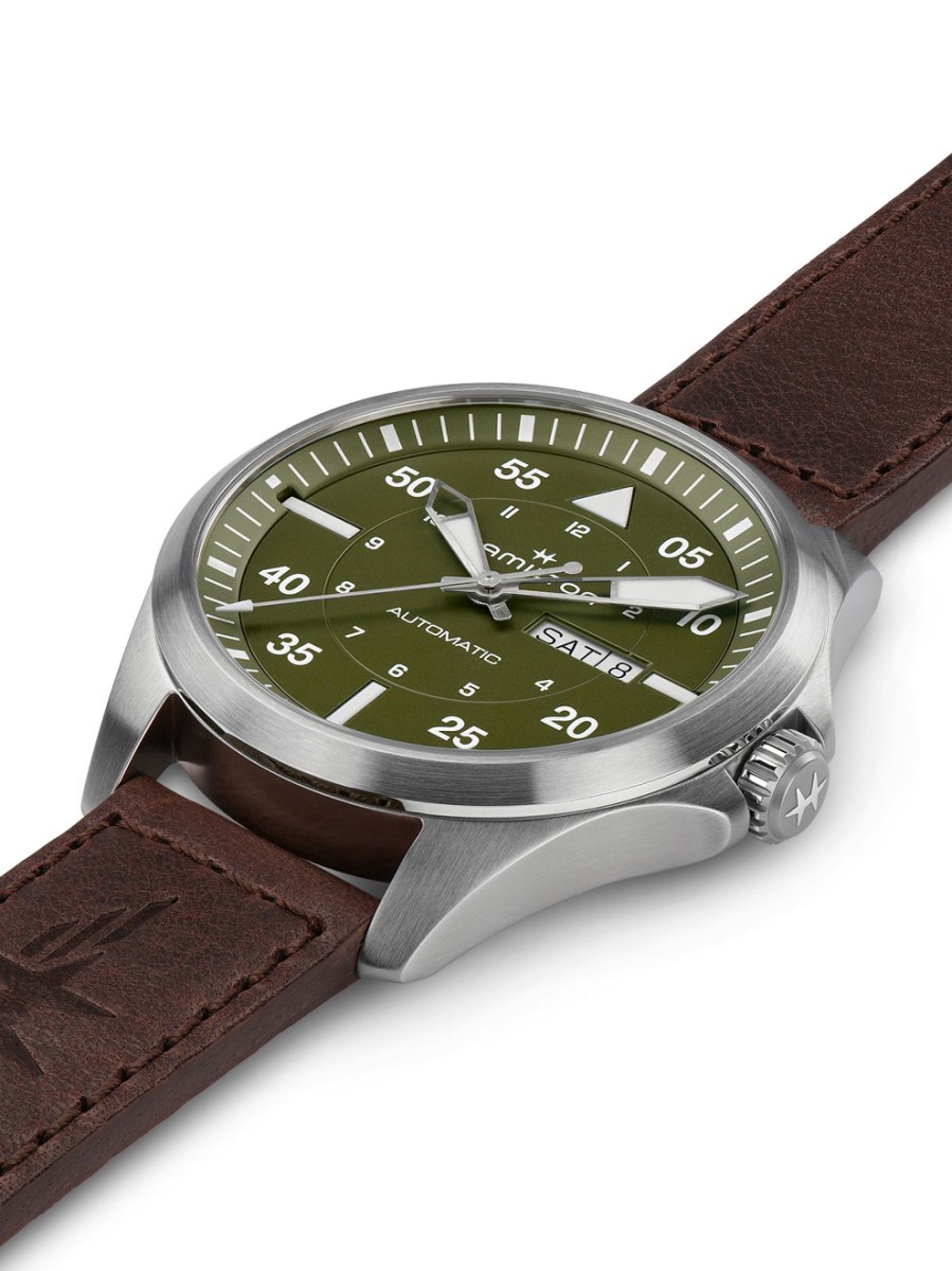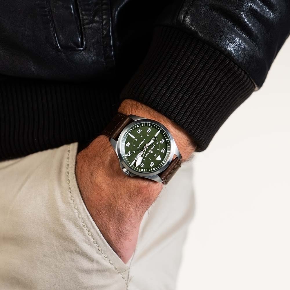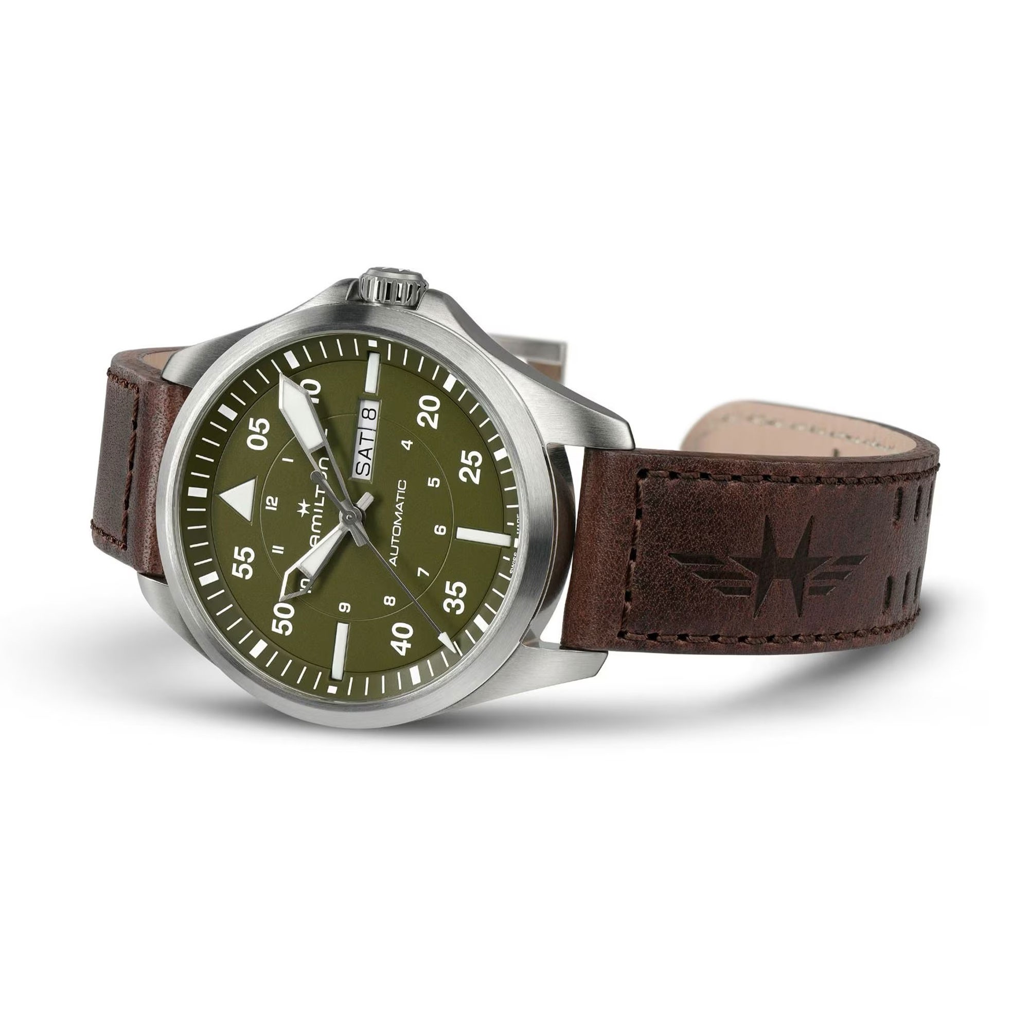 Hamilton Khaki Pilot H64635560 is een stijlvol, Zwitsers horloge met een automatisch uurwerk. Het heeft een 42mm ronde, roestvrijstalen kast, groene wijzerplaat met Arabische cijfers en saffierglas. Dit analoge polshorloge is waterbestendig tot 10 ATM en antiallergisch. De bruine leren band maakt het perfect voor elke gelegenheid. Draag het met uw casual of formele outfit.