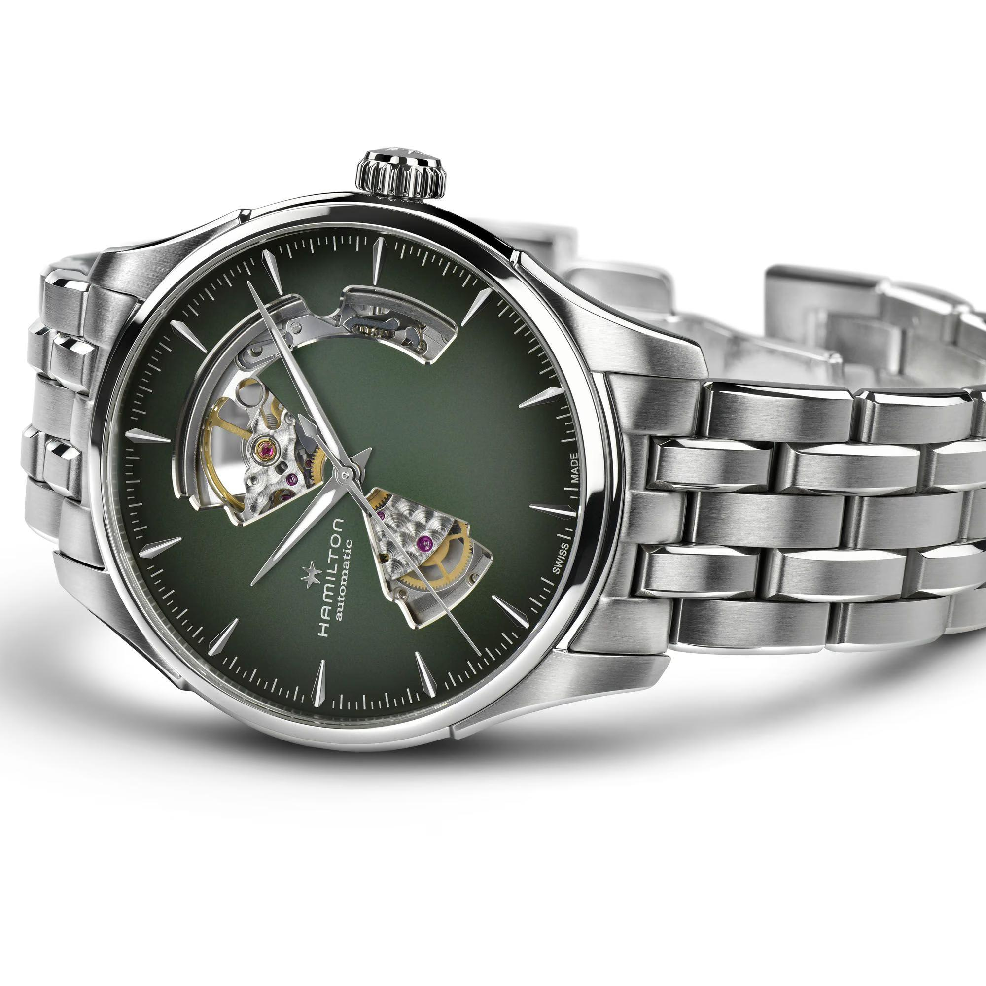De Hamilton Jazzmaster Open Heart horloge, model H32675160, heeft een Zwitsers automatisch uurwerk en een groene analoge wijzerplaat in een roestvrijstalen ronde kast van 40 mm. Het beschikt over saffierglas en is hypoallergeen. Perfect voor dagelijks gebruik met zilverkleurige roestvrijstalen band. Waterdicht tot 50 meter. Draag formeel of casual voor een stijlvol accent.