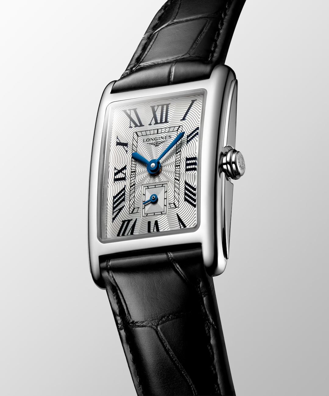 De Longines DolceVita L52554710 is een elegante polshorloge met Zwitserse kwartsbeweging, rechthoekige kast van roestvrij staal en saffierglas. De wijzerplaat is zilverkleurig met Romeinse cijfers en een gestreept patroon. Het horloge heeft een zwarte krokodillen lerenband. Ideaal voor formele gelegenheden of dagelijks gebruik.