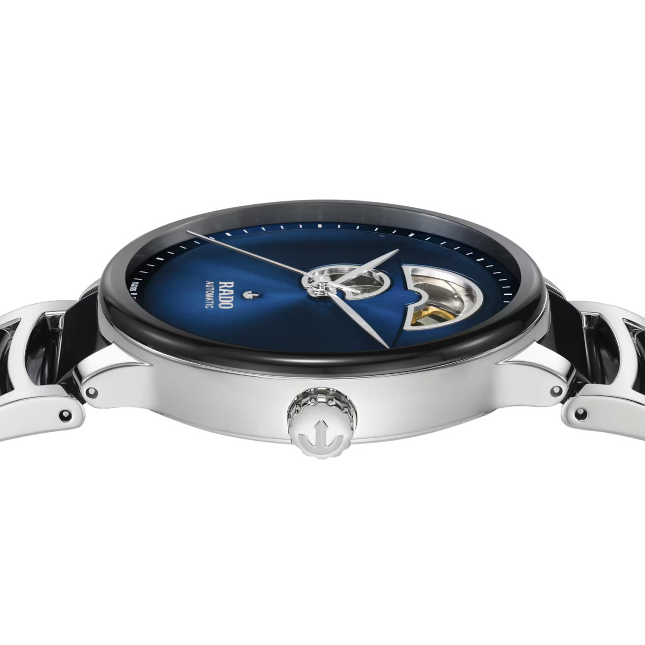 De Rado Centrix Automatic Open Heart R30012202 horloge is stijlvol met zijn blauwe analoge wijzerplaat en zilverkleurige, ronde keramische kast van 39,5 mm. Het heeft een zwart keramisch bandje, saffierglas en is waterdicht tot 5 bar. Het horloge is automatisch en niet-allergeen. Ideaal voor dagelijks gebruik en formele gelegenheden. Draag het met vertrouwen en verfijning.