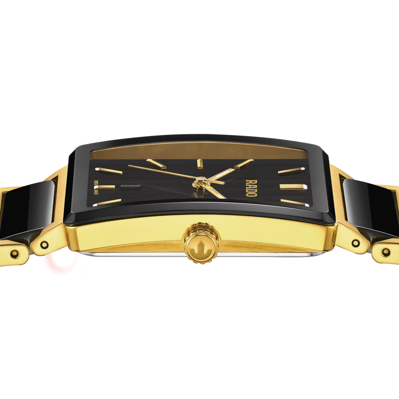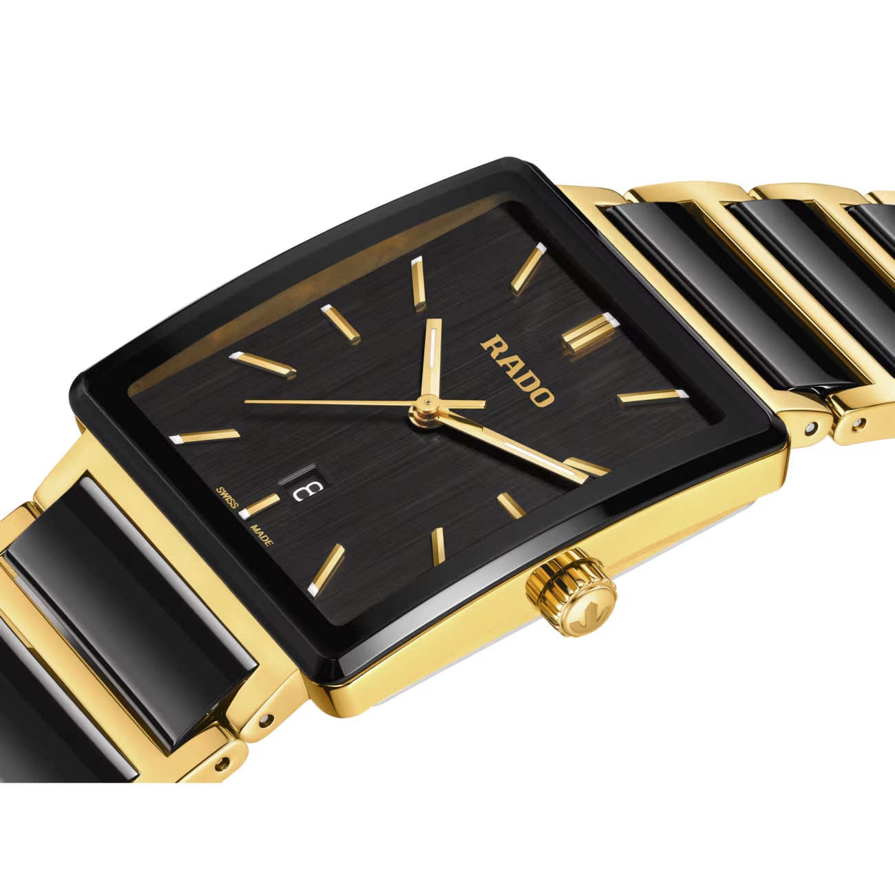 De Rado Integral Stainless Steel R20256162 horloge heeft een elegant ontwerp met een roestvrijstalen kast en band met goudkleurige PVD coating. Dit analoge horloge heeft een vierkante kast met saffierglas, een zwarte wijzerplaat met streepindexen, en een datumaanduiding. Het is nikkelvrij, antiallergisch en waterbestendig tot 5 ATM. Draag het als een stijlvol accessoire voor formele gelegenheden.